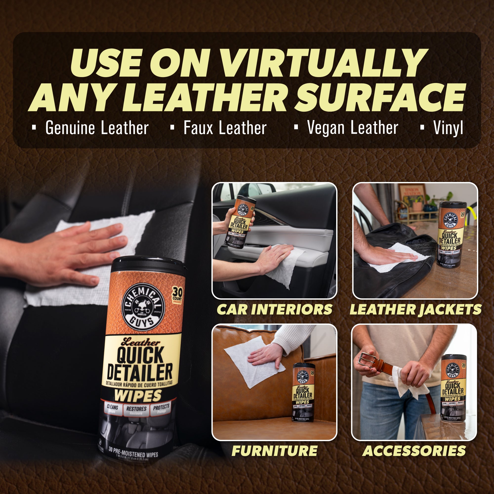 These heavy-duty ready-to-use. pre-moistened wipes feature an advanced high-performance texture weave that easily cleans. restores. and protects leather surfaces in your ride. and elsewhere!?