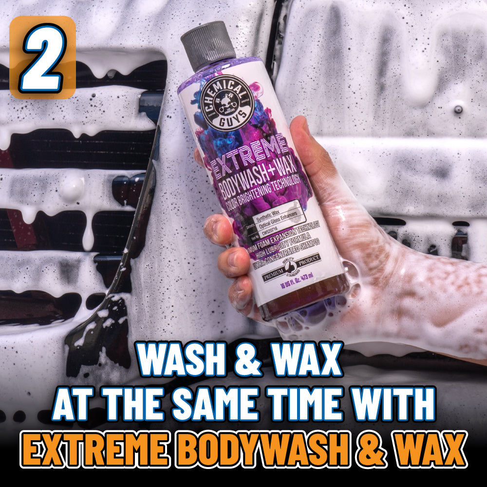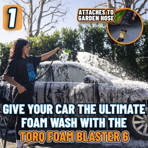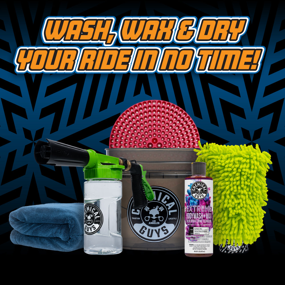 The Megalodon Complete Care Kit offers everything for an upgraded shine. It includes premium dual-wax car soap. a 24×36 microfiber towel that absorbs over a gallon of water. a dirt trap. a foam blaster for max suds. and a heavy-duty bucket. Achieve spotless shine and lasting protection with ease and style.